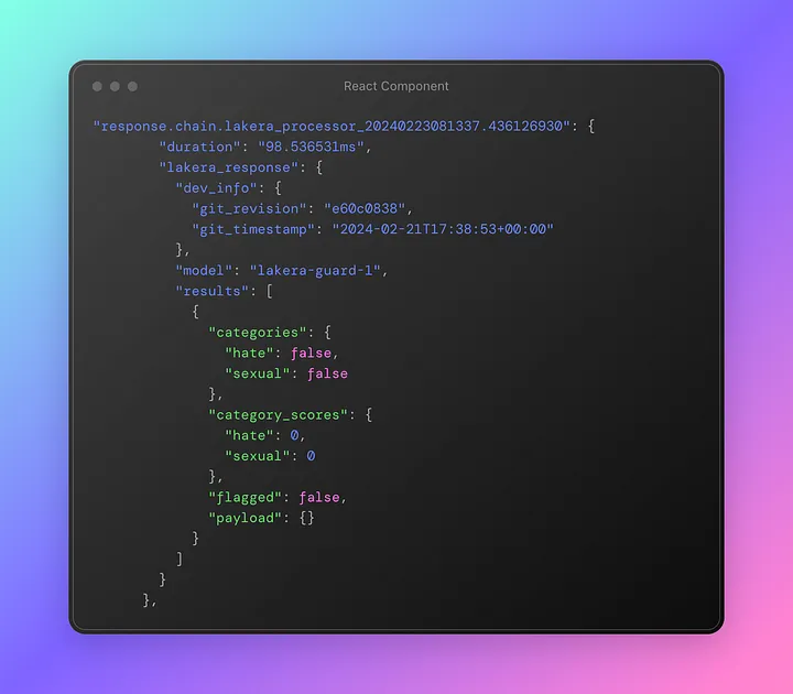 Below, we have enabled LakeraAI for Content Moderation. Highflame provides detailed telemetry. On the processor's execution, latency and response metadata enforce controls. At the time of writing, Lakera’s endpoint only supports taxonomies for hate & sexual content, and you get back scores for both.