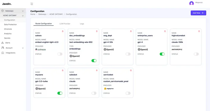 Analytics — Javelin Cloud provides detailed analytics on the usage of different models, broken down by routes and providers. This feature enables enterprises to track and analyze how applications and users utilize the models, offering optimization and resource allocation insights.