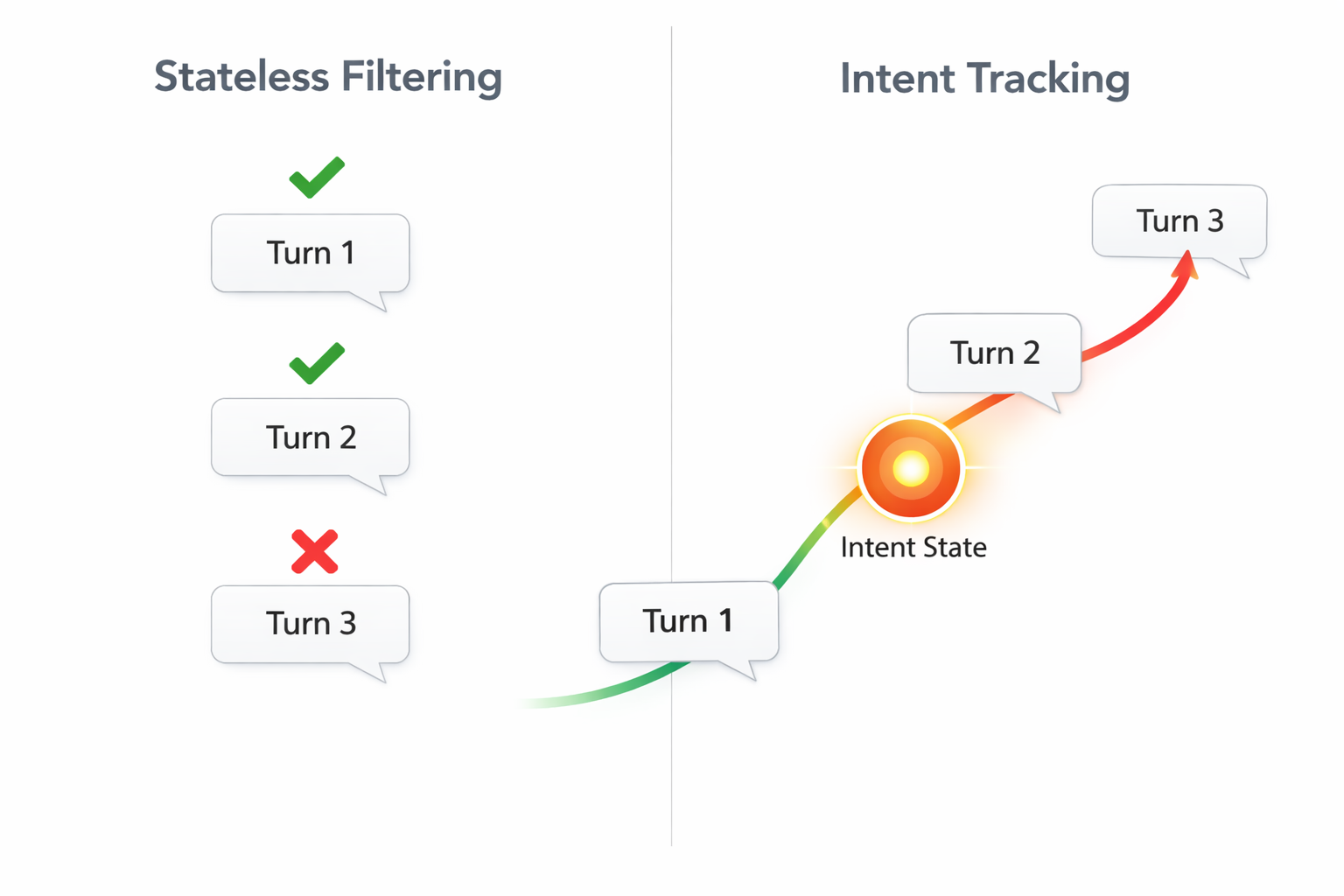 Stateless security evaluates interactions in a vacuum. Generation-1 scanners look for prohibited keywords or regex patterns, assuming that if a single message doesn't look "bad," the session is safe.