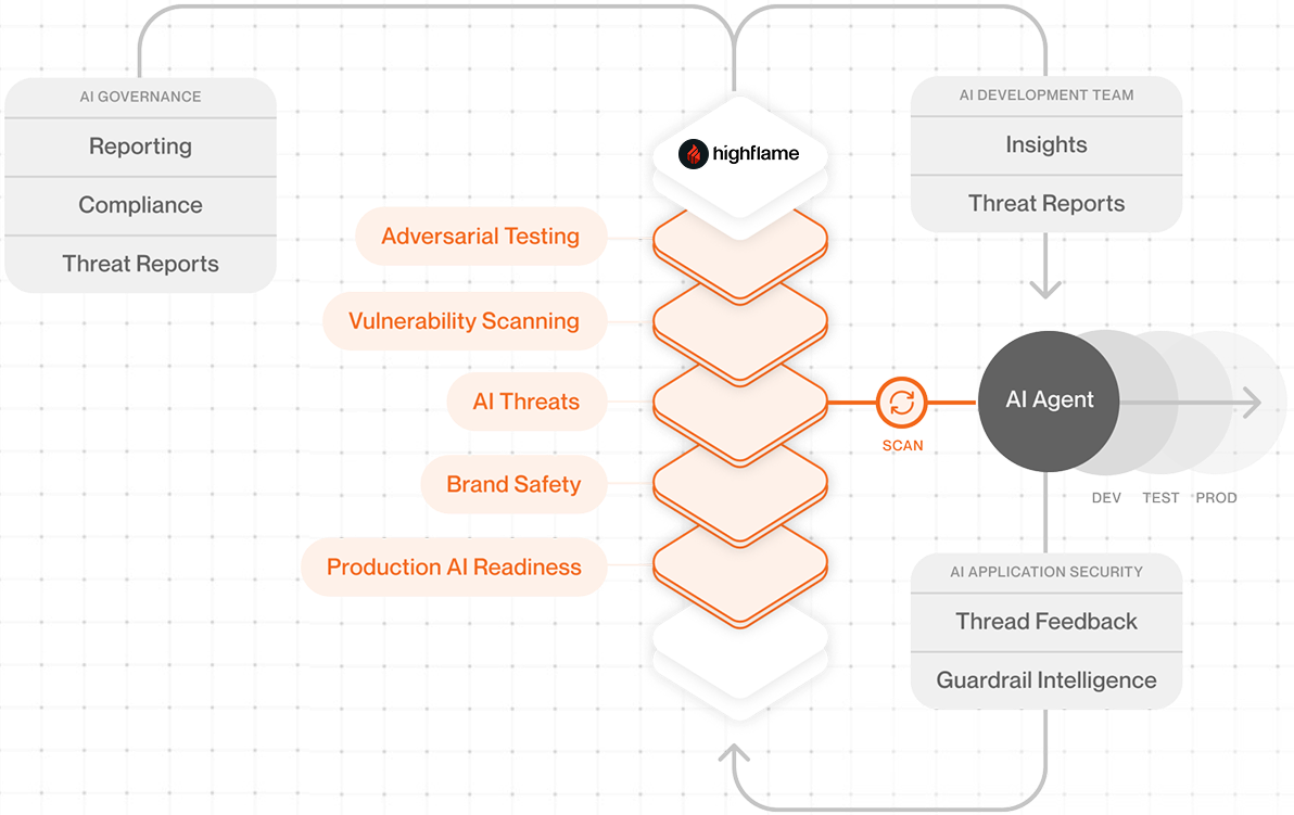 Because AI threats evolve faster than humans can test, models retrain, agents adapt, and new tools appear daily, each creating fresh attack surfaces. Highflame Red runs 24 × 7 adversarial simulations that learn, probe, and refine, ensuring your protections never fall behind.